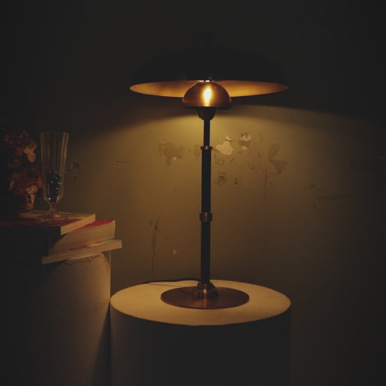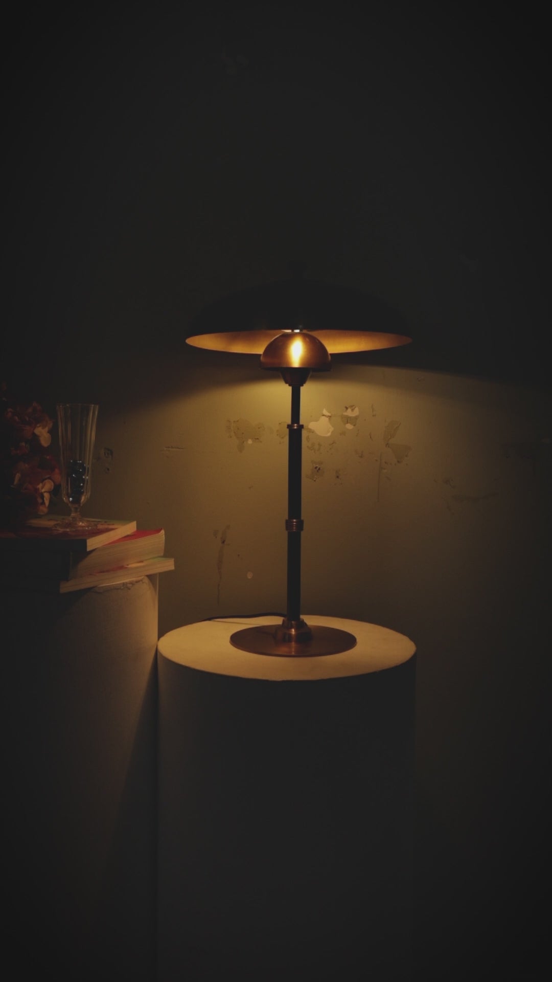This table lamp exudes vintage charm with its classic design and warm,metalic finish.The unique shade shape adds a touch of personality.